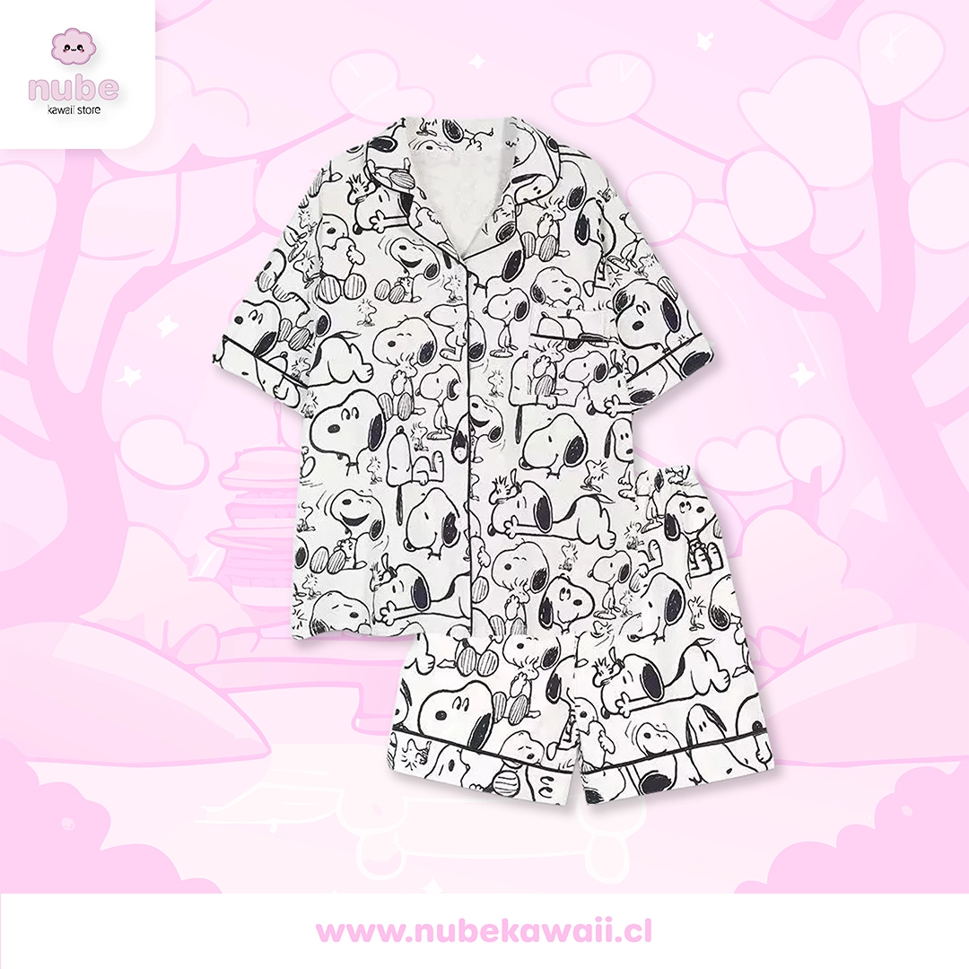 Conjunto de dos piezas confeccionado en tela suave y respirable, perfecto para descansar con estilo. Su diseño de Snoopy le da un toque divertido y juvenil, ideal para dormir o relajarse en casa.